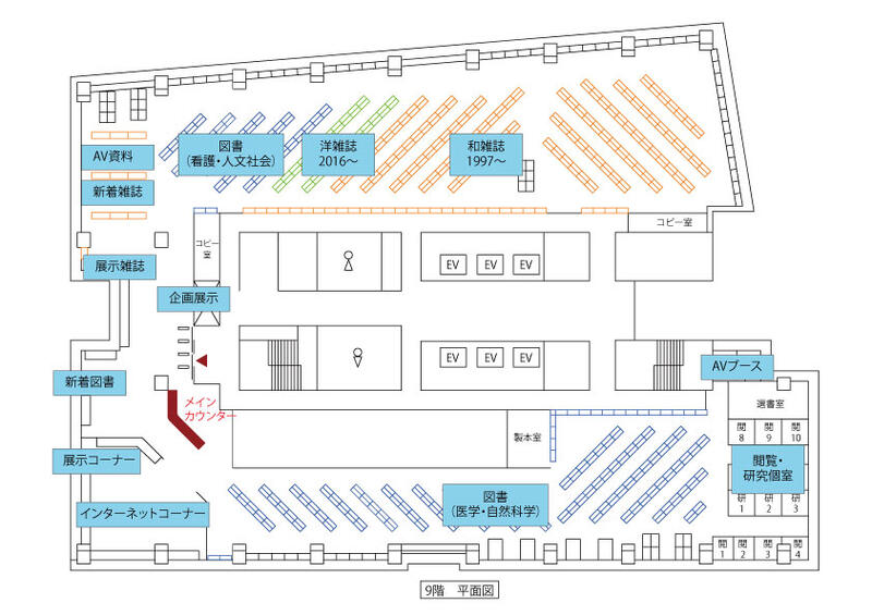 - あべのメディックス9階 メインカウンターと図書・雑誌・AV資料のフロア