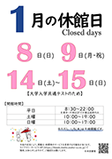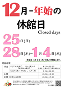 年末年始につきまして、12/25(日)および12/28(水)-1/4(水)は休館します。ご不便をおかけしますが、ご理解の程よろしくお願いいたします。