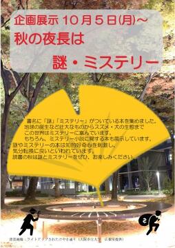 10月企画展示「秋の夜長は 謎・ミステリー」書名に「謎」「ミステリー」がついている本を集めました。